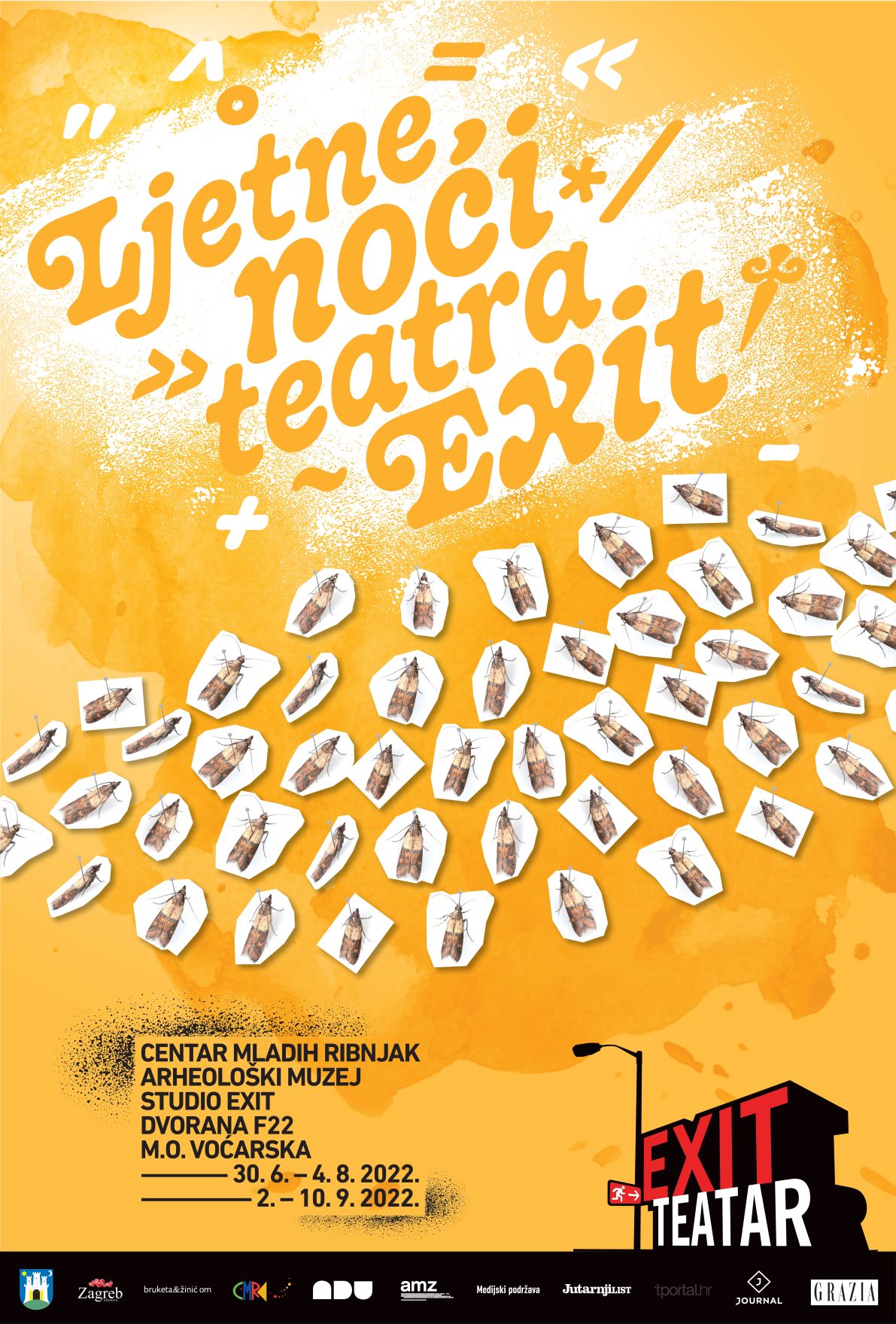 U sklopu ovogodišnjih Ljetnih noći Teatra EXIT bit će izvedeno sveukupno 40 izvedbi i 22 različita naslova, a predstave će se održati na pet različitih lokacija: krovna terasa Centra mladih Ribnjak (Park Ribnjak 1), Lapidarij Arheološkog muzeja (Zrinjevac 19), Studio EXIT (Gundulićeva 37/1), Dvorana F22 (Frankopanska 22) i Mjesni odbor Voćarska (Voćarska cesta 71). Manifestaciju u četvrtak 30.6. otvara Zijah A. Sokolović za svojom kultnom životnom komedijom CABAres CABArei koja će biti izvedena u predivnom Lapidariju zagrebačkog Arheološkog muzeja.
